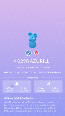 This is a page on the pokemon azurill, including its learnable moves and where it can be found in pokemon sword and shield. Level move type category 1 splash: Most pokémon evolve when their friendship level reaches 220. He'll be able to evolve again to azumarill at level 18 or above, which it may be already when you're evolving him the first time, but when you do that second evolution is up to you. How do i get azurill to evolve into marill. You can try the penny trick in luminose city if you want. It evolves into marill when leveled up with high friendship, which evolves into azumarill starting at level 18. Azurill appears to be based on a small mouse combined with a beach ball. Name type 1 type 2 gender azurill: Azurill #298 type catch rate 150 abilities hidden abilities thickfat hugepower: In generation 5, azumarill has a base experience yield of 185. Increase the friendship level of azurill. A full list of evolution changes can be found below.